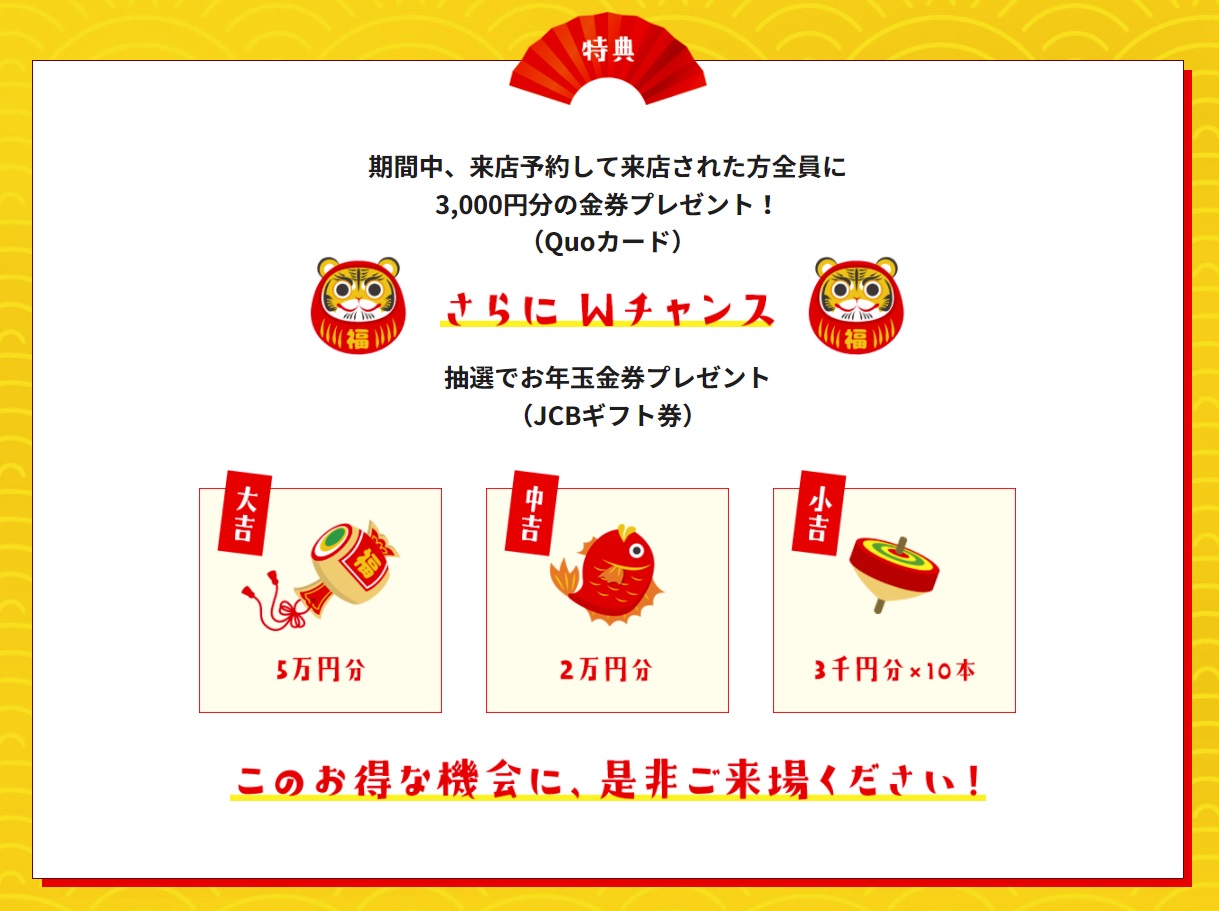 【大吉:5万円分×1名様、中吉:2万円分×1名様、小吉:3千円分×10名様】