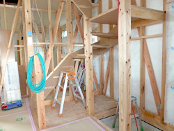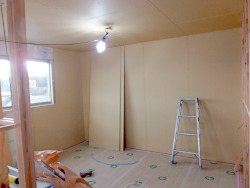只今、階段取付と2階天井・壁の石膏ボード貼りを行ってます。