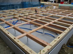 今日は、木造住宅の骨組みの一番下となる部分を組み立てています。