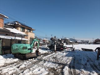 本日より、砕石パイル工法にて地盤改良工事をしています