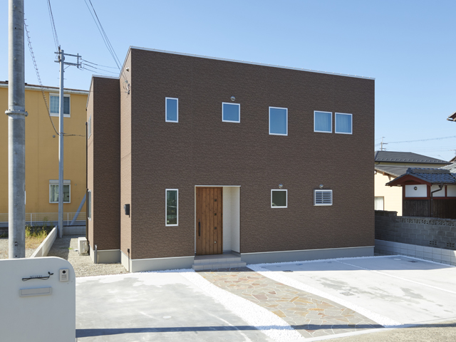 道路からは家の中の様子を分かりづらくしたシンプルな外観。外も中も色味をあたたかみのあるブラウンで統一し、ほっと落ち着く印...