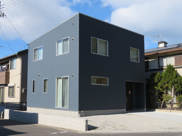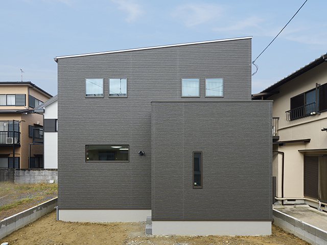 シャープなキューブ型に、ダークネイビーの外壁がかっこいい外観。日当たりの良い室内は、天井まであるハイタイプドアを採用した...