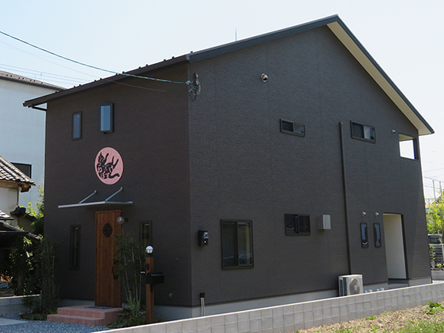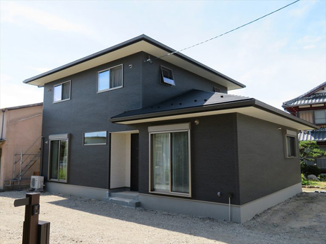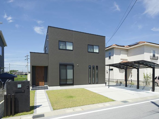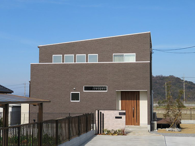 ”八幡山を望める”のどかな環境でゆったり暮らす家 大きな片流れの屋根と1階部分にボリュームのあるファサード。 植...