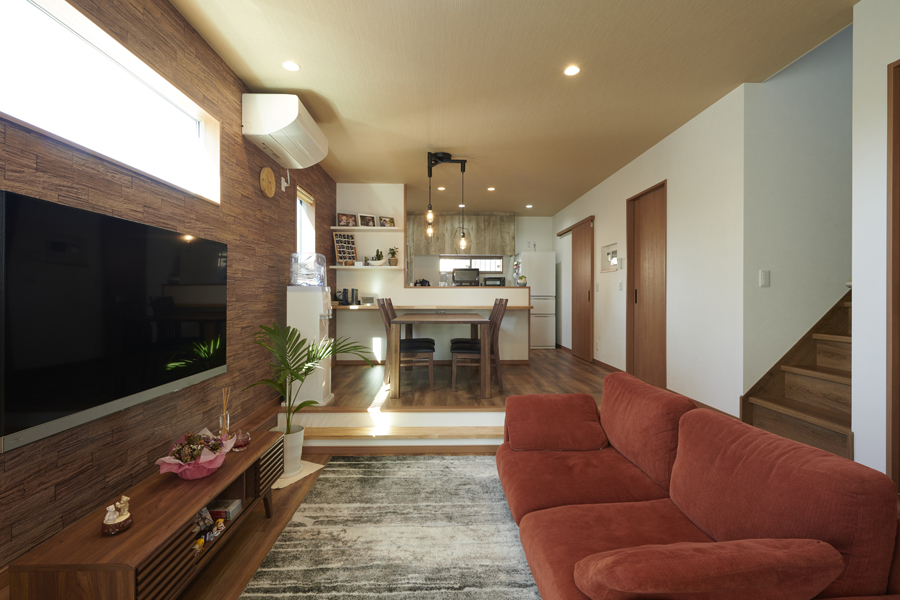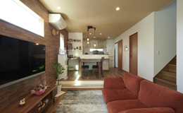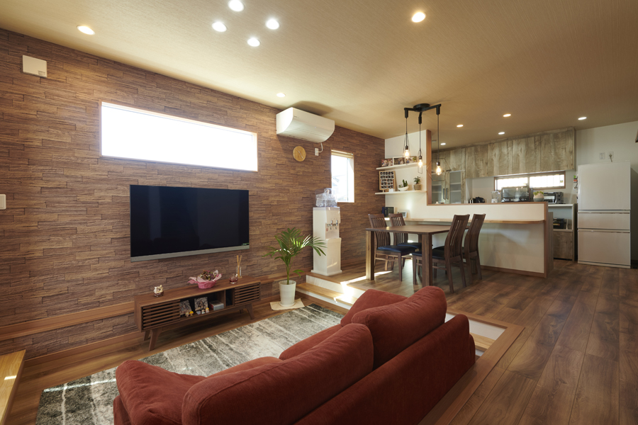 リビングは、一段下がったダウンフロアスタイル。ソファはもちろん、床や段差部分に腰を落ち着けるのもゆったりとくつろげます。