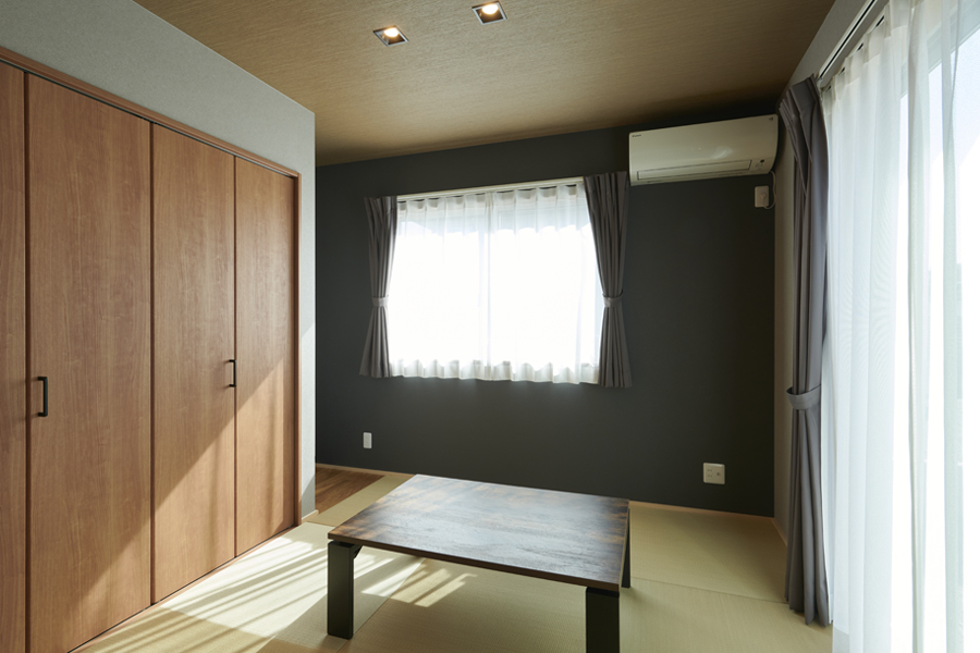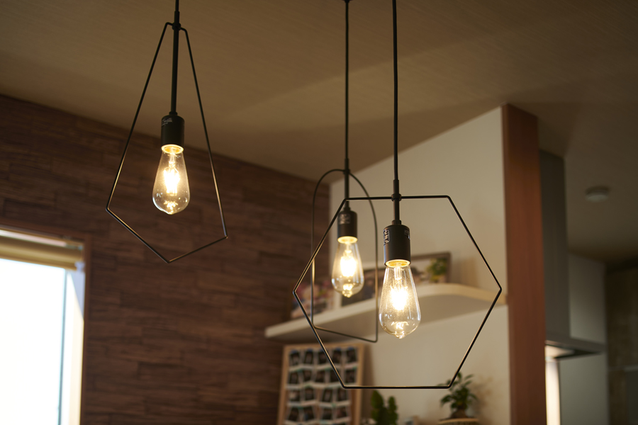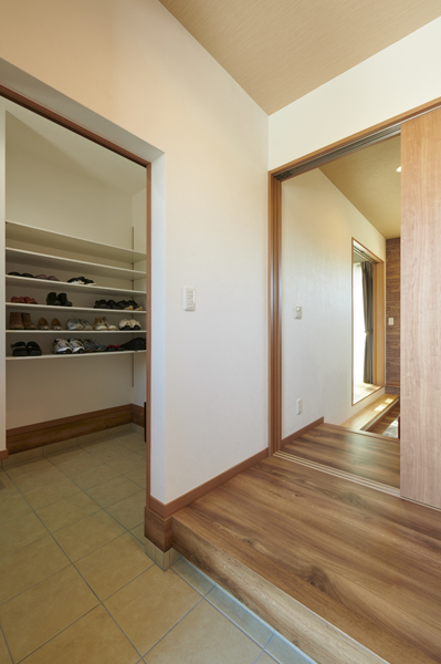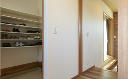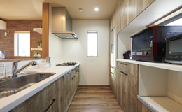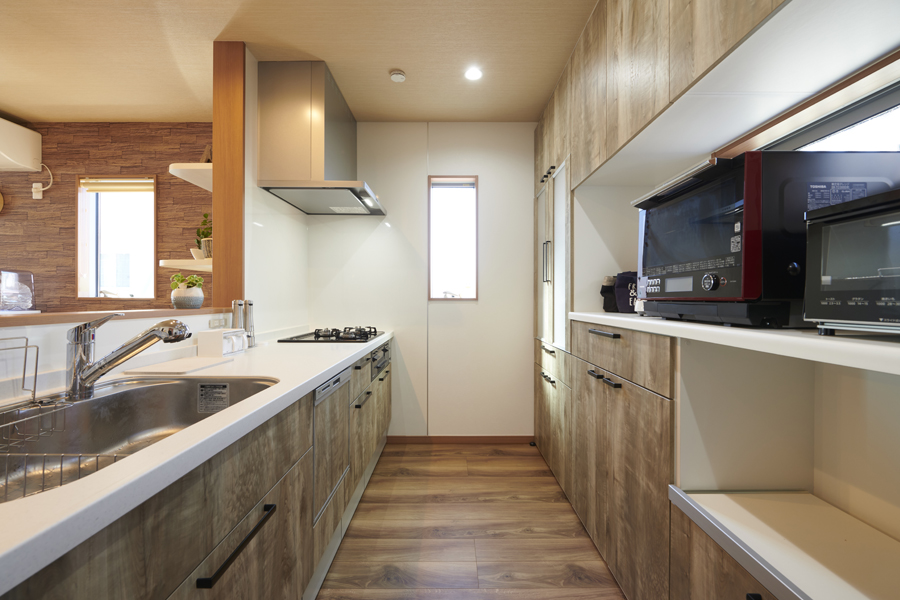 玄関土間やキッチン背面などに収納スペースを確保、防犯対策を施した2階サンルームで室内干しなど、使い勝手にもこだわりを。太陽光発電システムを搭載し、地球とお財布にもやさしい防犯+ZEH住宅です。