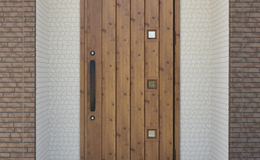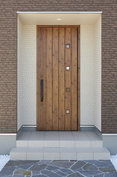 道路からは家の中の様子を分かりづらくしたシンプルな外観。外も中も色味をあたたかみのあるブラウンで統一し、ほっと落ち着く印象です。