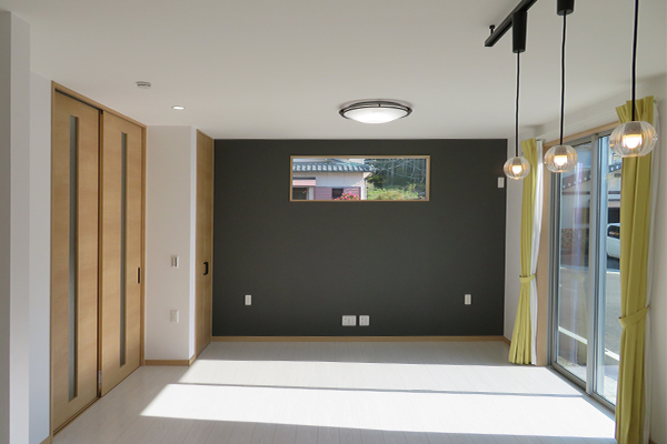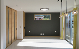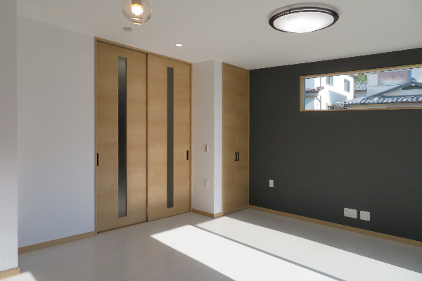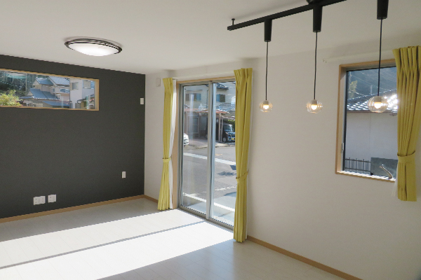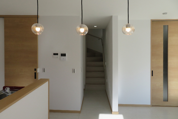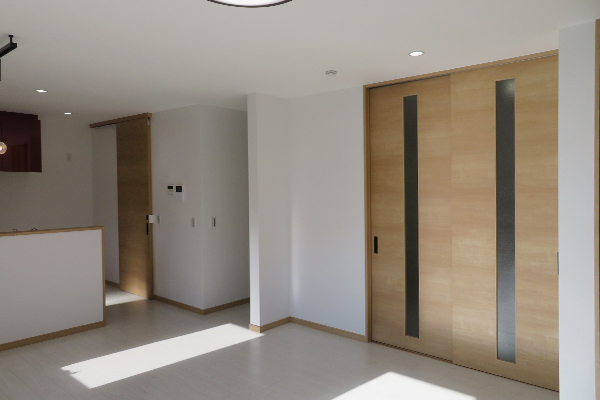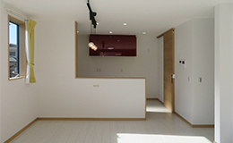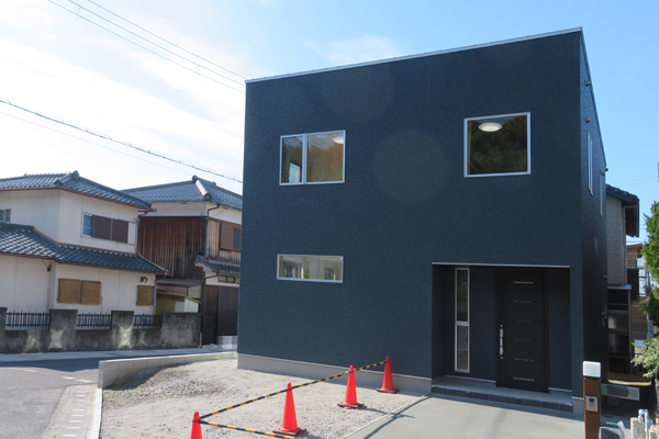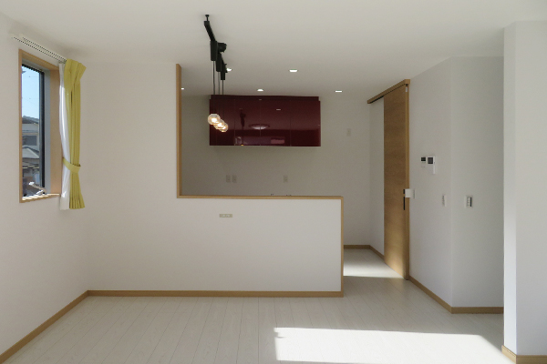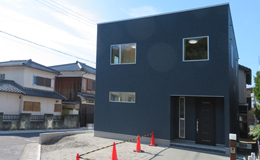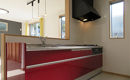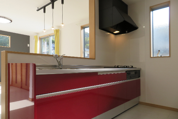 シャープなキューブ型に、ダークネイビーの外壁がかっこいい外観。日当たりの良い室内は、天井まであるハイタイプドアを採用したことですっきり広く感じられます。キッチンはパッと目を引く赤色に。毎日楽しくお料理できそうです。横並びに洗面脱衣所を配置したことで家事導線もスムーズです。