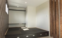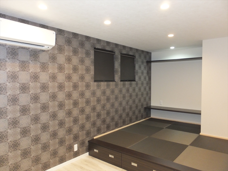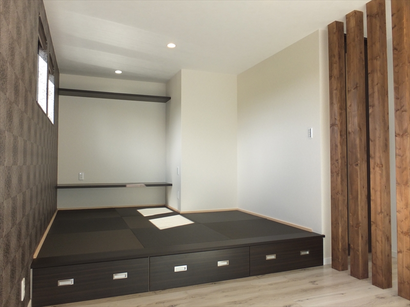 リビングと繋がる和空間には造作カウンターや畳下を利用した引き出し収納などを工夫し、リビング空間に奥行きと立体感をプラスしています。