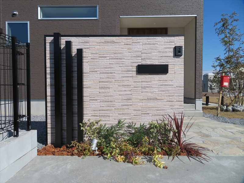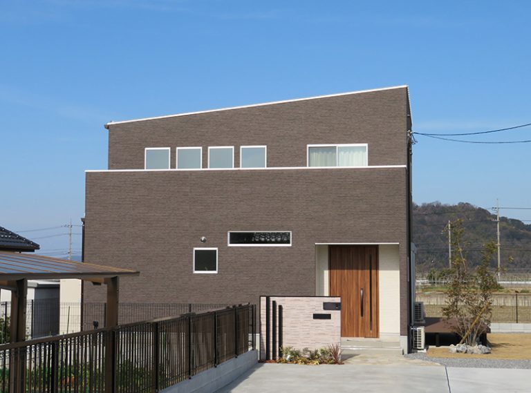 大きな片流れの屋根と1階部分にボリュームのあるファサード。